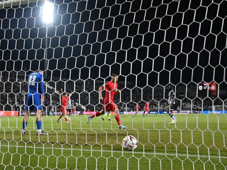 Darius Dumitru Olaru se bucură dupa un gol marcat in poarta lui Dominik Kotarski in meciul dintre PAOK Salonic si FCSB, din cadrul UEFA Europa League, desfasurat pe Stadionul Toumba din Salonic, joi 3 octombrie 2024. © FOTO:Razvan Pasarica/SPORT PICTURES