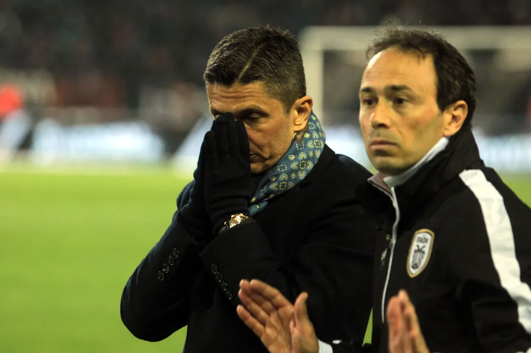 Razvan Lucescu (L), FC PAOK , coach with Diego Longo (r) assistant coach during interruption of match