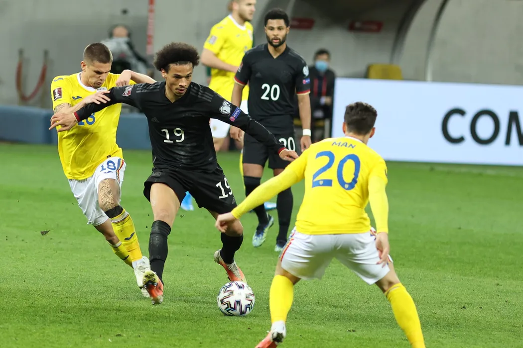 Razvan Marin (S), de la Romania, lupta pentru balon cu Leroy Sane (D), de la Germania in meciul de fotbal din etapa a doua a preliminariilor Campionatului Mondial, disputat pe Arena Nationala din Bucuresti, duminica, 28 martie 2021. GEORGE FILIP / MEDIAFAX FOTO