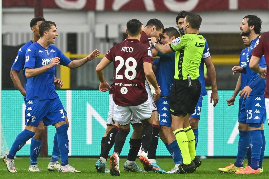 Olimpic Stadium Grande Torino, 09.10.22 Pietro Pellegri (11 Torino FC) and Razvan Marin (18 Empoli FC) collide during the Serie A match Torino FC and Empoli FC at Olimpic Stadium Grande Torino in Torino, Italia Soccer (Cristiano Mazzi / SPP),Image: 729392209, License: Rights-managed, Restrictions: World Rights Except Brazil * BRAOUT, Model Release: no