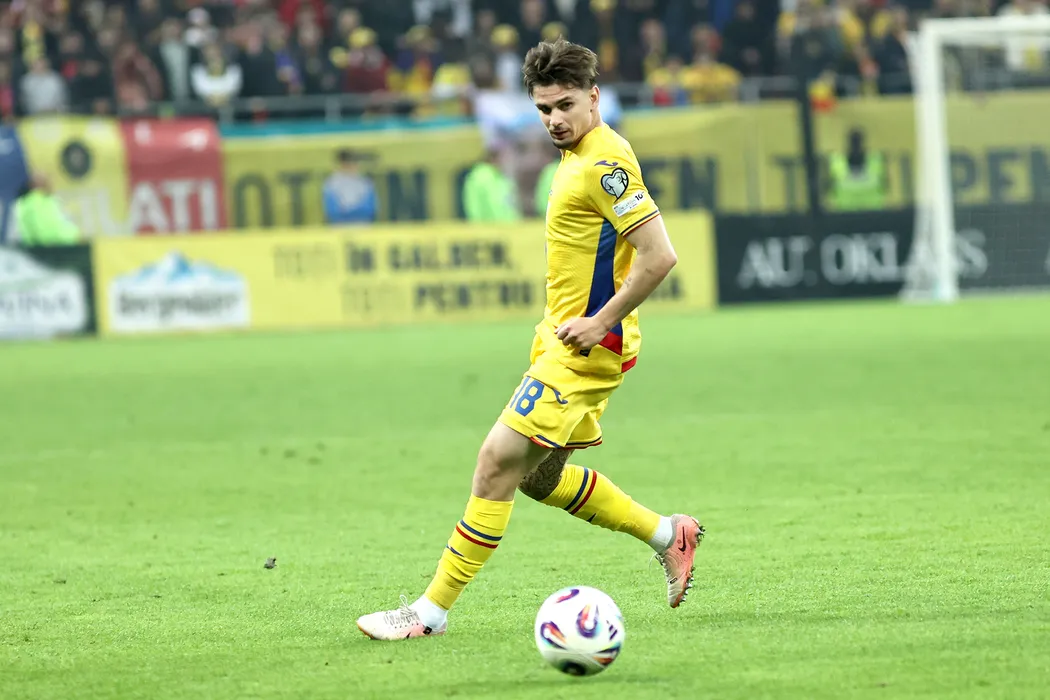 Razvan Marin, de la echipa nationala de fotbal a Romaniei, suteaza in timpul meciului contra selectionatei Bosniei din preliminariile Campionatului Mondial 2026, disputat pe Arena Nationala din Bucuresti, vineri, 21 martie 2025. GEORGE FILIP / MEDIAFAX FOTO