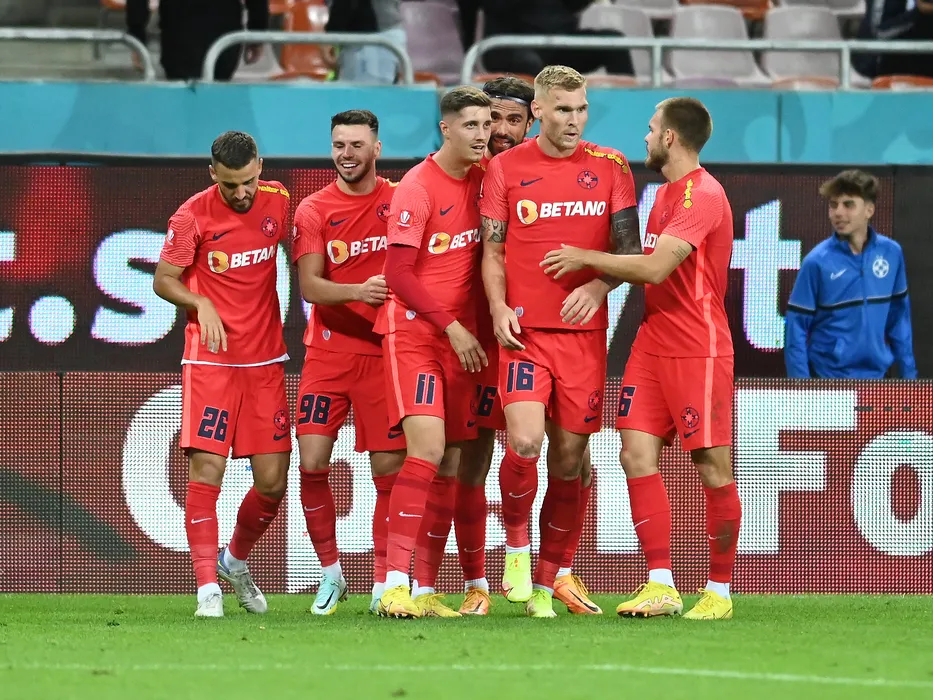Bucurie a fotbalistilor stelisti dupa un gol marcat cu Razvan Constantin Oaida, Andrei Ioan Cordea, David Raul Miculescu, Andrea Compagno, Joonas Tamm si Denis Gratian Harut in meciul de fotbal dintre FCSB si FC Arges, contand pentru Superliga Superbet, desfasurat pe Arena Nationala din Bucuresti, duminica 2 octombrie 2022. © FOTO:Razvan Pasarica/SPORT PICTURES