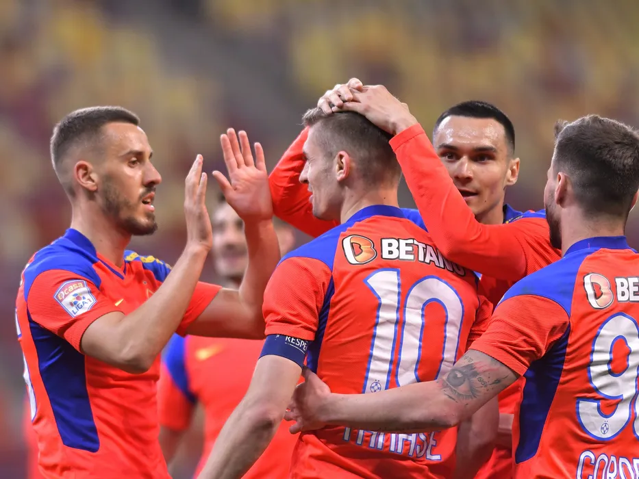 Florin Lucian Tanase se bucura dupa un gol marcat alaturi de Razvan Constantin Oaida si Adrian Gheorghe Sut in meciul de fotbal dintre FCSB si FC Voluntari, contand pentru Play-off-ul Ligii 1 Casa Pariurilor, desfasurat pe Arena Nationala din Bucuresti, luni 11 aprilie 2022. © FOTO:Razvan Pasarica/SPORT PICTURES