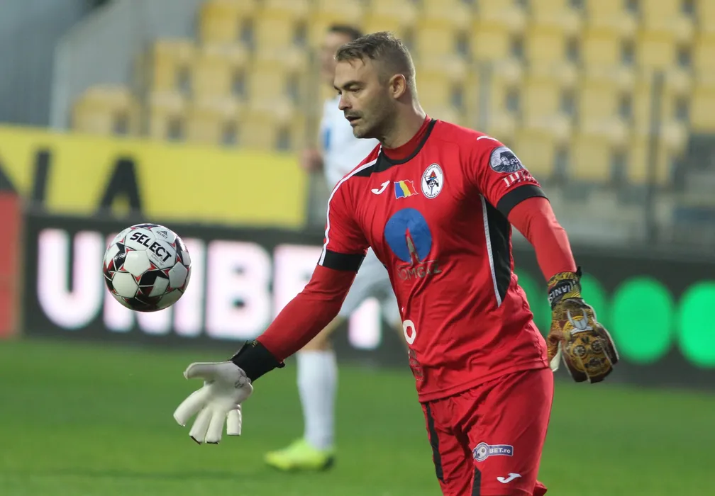 Portarul Razvan Plesca, de la Gaz Metan Medias, suteaza in timpul meciului de fotbal contra echipei Chindia Targoviste, din etapa a XIV-a a Ligii 1, desfasurat pe stadionul Ilie Oana din Ploiesti, sambata, 26 octombrie 2019. GEORGE FILIP/ MEDIAFAX FOTO
