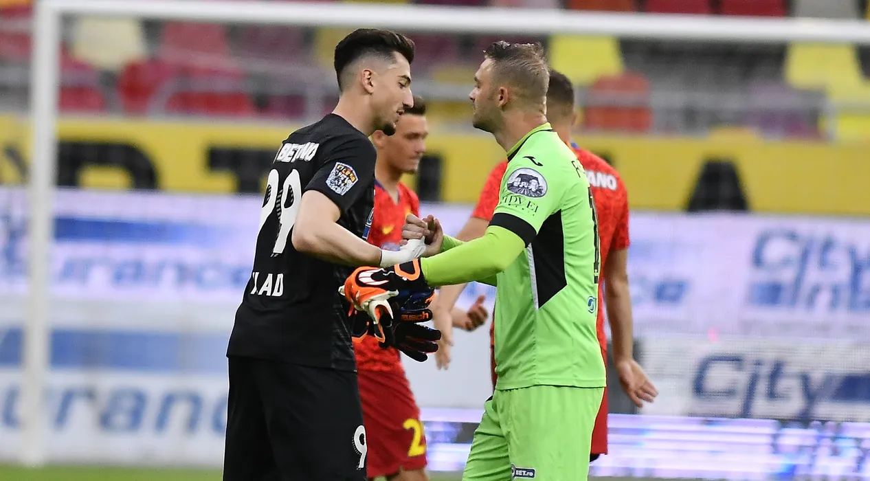 Portarii celor doua echipe Andrei Daniel Vlad si Razvan Nicolae Plesca se saluta inaintea meciului de fotbal dintre FCSB si Gaz Metan Medias, contand pentru play-off-ul Ligii 1 Casa Pariurilor, disputat fara spectatori pe Arena Nationala din Bucuresti, duminica 21 iunie 2020. © FOTO:Razvan Pasarica/SPORT PICTURES