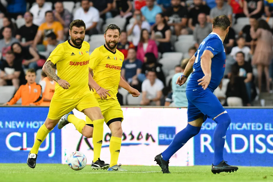 Meciul amical de fotbal dintre echipele Romania si World Stars, partida care marcheaza retragerea lui Adrian Mutu de la echipa nationala, din cadrul Sports Festivals, disputat in Cluj-Napoca, duminica, 12 iunie 2022. In imagine: Adrian Mutu si Razvan Rat. FLAVIU BUBOI / MEDIAFAX FOTO