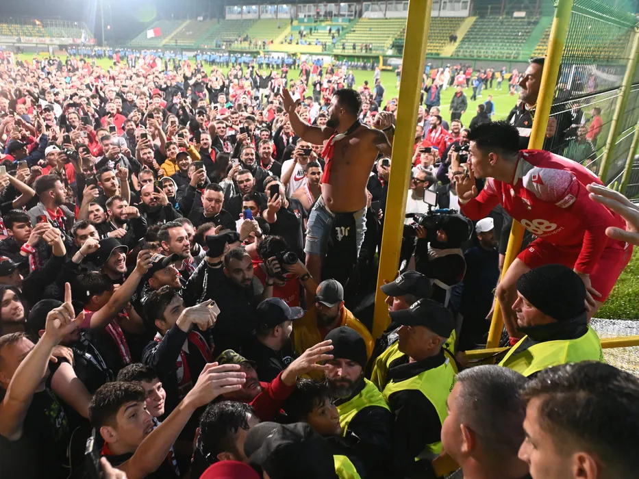 Suporterii dinamovisti se bucura alaturi de Alin Serban dupa promovarea in prima liga a echipei favorite in urma meciului de fotbal dintre FC Arges si Dinamo Bucuresti, contand pentru mansa retur a Barajului pentru mentinerea in Superliga Superbet, desfasurat pe Stadionul Orasenesc din Mioveni, sambata 3 iunie 2023. © FOTO:Razvan Pasarica/SPORT PICTURES