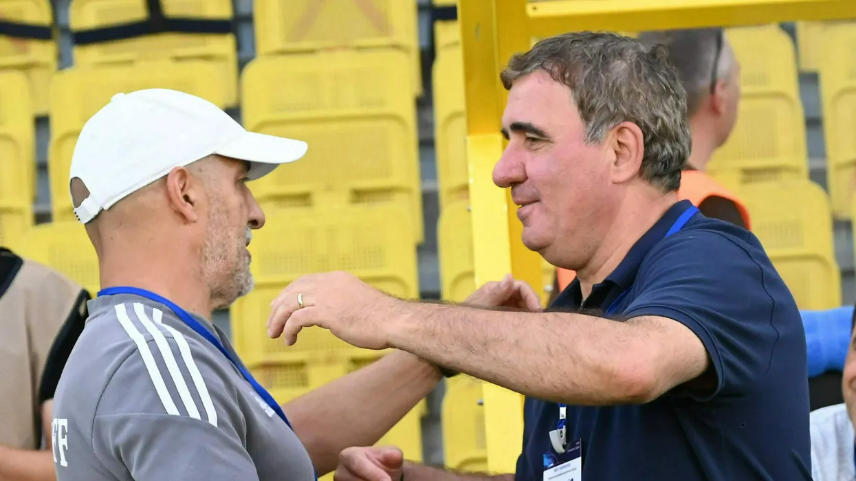 Cei doi antrenori Gheorghe Hagi si Roberto Bordin se saluta inaintea meciului de fotbal dintre FC Sferiff Tiraspol si FCV Farul Constanta, din cadrul Preliminariilor Ligii Campionilor, desfasurat pe Stadionul Sheriff din Tiraspol, marti 18 iulie 2023. © FOTO:Razvan Pasarica/SPORT PICTURES