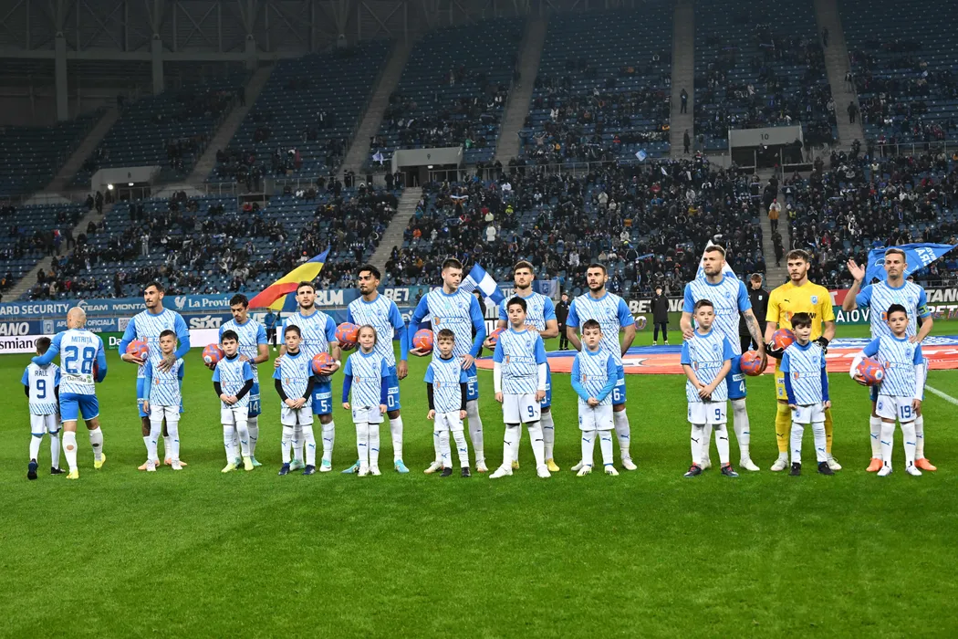 Fotbaliștii craioveni la startul meciului de fotbal dintre Universitatea Craiova si FC Voluntari, contând pentru Superliga Superbet, desfășurat pe Stadionul Ion Oblemenco din Craiova, luni 26 februarie 2024. © FOTO: Răzvan PĂSĂRICĂ/SPORT PICTURES