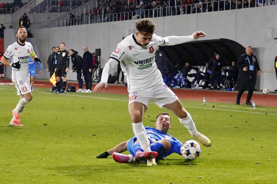 Carlos Andrei Mora Montoya si Kevin Andrei Ciubotaru, Cristian Daniel Negut in meciul de fotbal dintre AFC Hermannstadt Sibiu si Universitatea Craiova, contand pentru Superliga Superbet, desfasurat pe Stadionul Municipal din Sibiu, duminica 14 decembrie 2025. © FOTO:Valentin Macrea/SPORT PICTURES