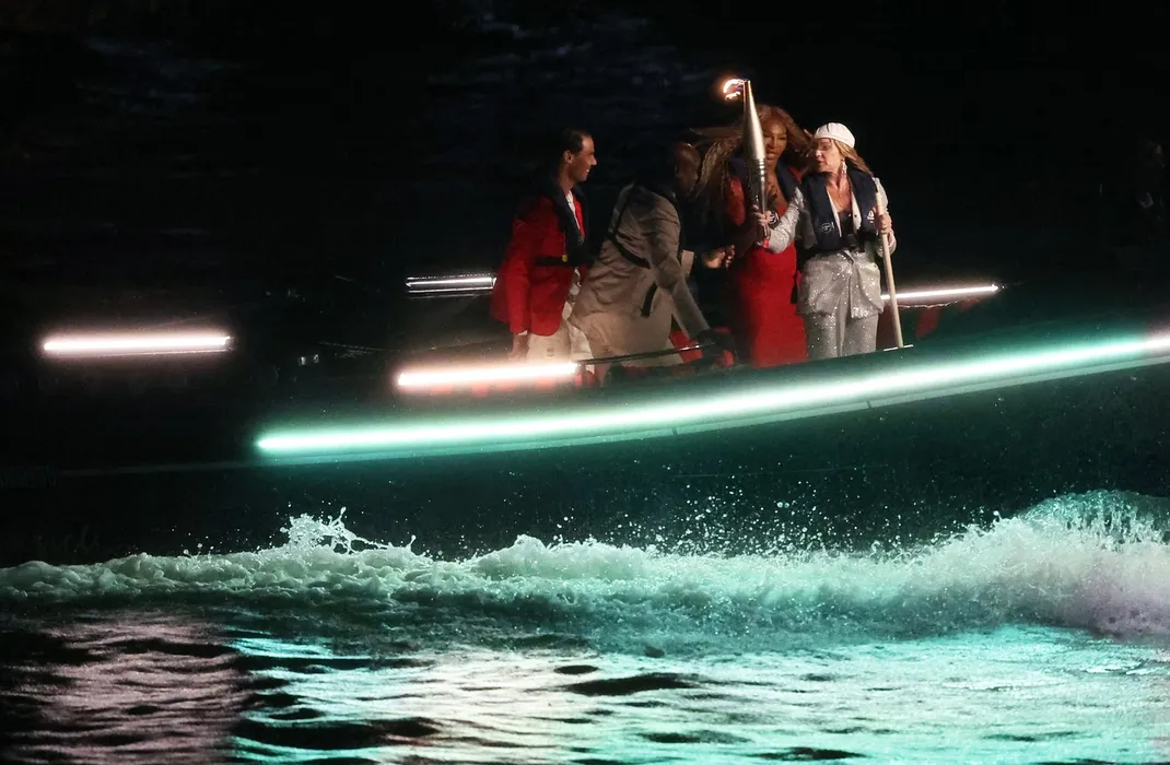 PARIS, July 26, 2024 -- Spanish tennis player Rafael Nadal, U.S. athlete Carl Lewis, Romanian gymnast Nadia Comaneci and U.S. tennis player Serena Williams travel on a boat on the river Seine during the opening ceremony of the Paris 2024 Olympic Games in Paris, France, July 26, 2024.,Image: 892814009, License: Rights-managed, Restrictions: , Model Release: no