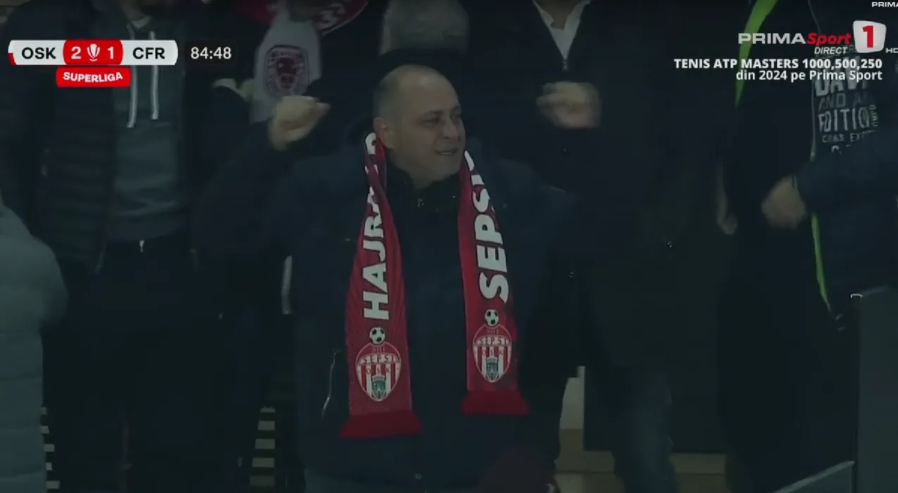 Reacția fabuloasă a lui Laszlo Dioszegi după ce Damașcan a marcat pentru 2-1 în meciul Sepsi – CFR Cluj! Era minutul 85 și patronul echipei finanțate și de guvernul Ungariei s-a dezlănțuit, fără să mai țină cont de camerele TV care îl filmau