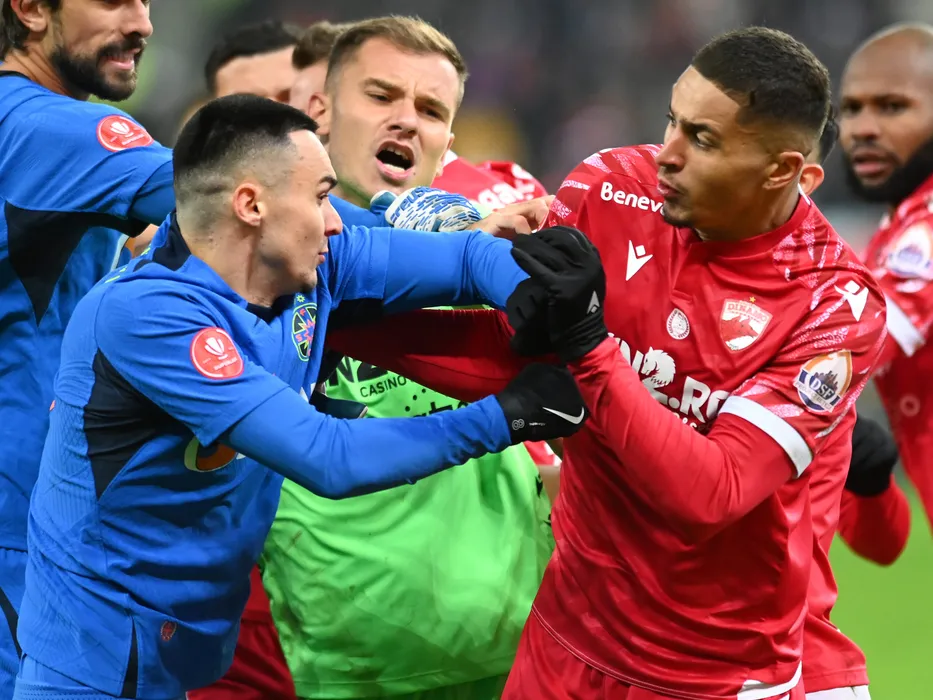 Jucatorii celor doua echipe Adrian Gheorghe Sut, Adnan Golubovic si Quentin Alexandre Julien Bena intr-o incaerare generala la meciul de fotbal dintre Dinamo Bucuresti si FCSB, din cadrul Superligii Superbet, desfasurat pe Arena Nationala din Bucuresti, duminica 26 noiembrie 2023. © FOTO:Razvan Pasarica/SPORT PICTURES