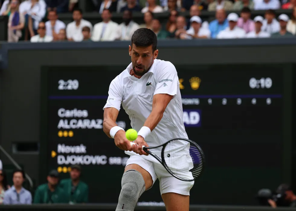 July 14, 2024, Wimbledon, London, England: 14th July 2024; All England Lawn Tennis and Croquet Club, London, England; Wimbledon Tennis Tournament, Day 14; Novak Djokovic (SRB) from the baseline against Carlos Alcaraz (ESP), Gentlemens Singles Final (Credit Image: © John Patrick Fletcher/Action Plus Sports via ZUMA Press Wire)