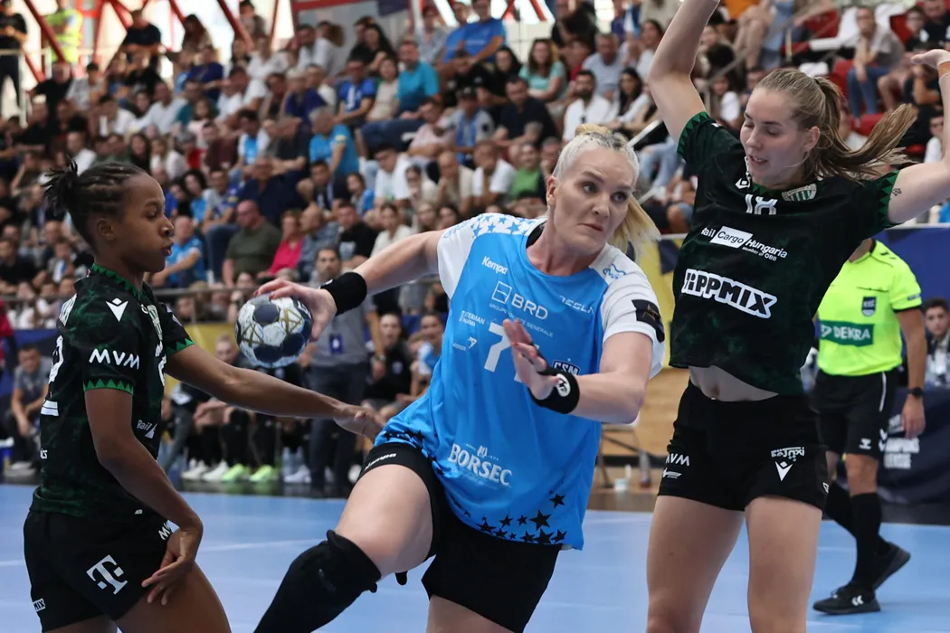 Crina-Elena Pintea si Orlane Kanor, Mette Tranborg in meciul de handbal feminin dintre CSM Bucuresti si FTC-Rail Cargo Hungaria, contand pentru Liga Campionilor, desfasurat in Sala Polivalenta Dinamo din Bucuresti, duminica 14 septembrie 2025. © FOTO:Gheorghe Fluster/SPORT PICTURES