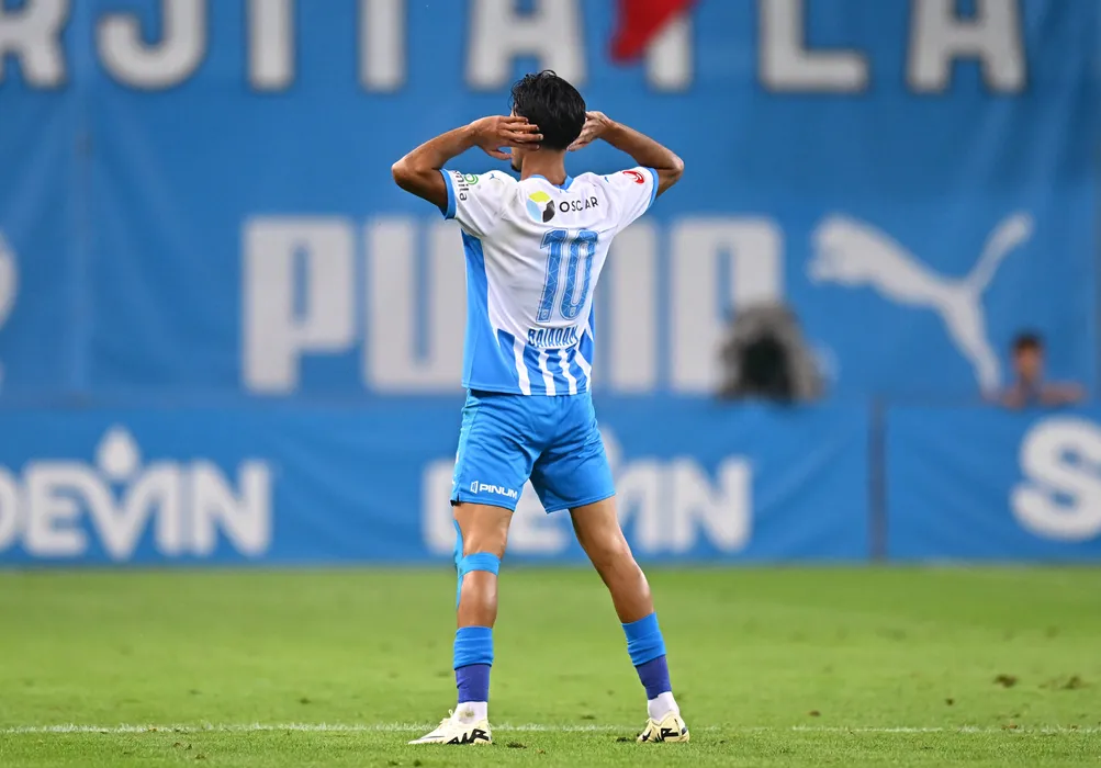 Stefan Baiaram se bucura dupa un gol marcat in meciul de fotbal dintre Universitatea Craiova si İstanbul Başakşehir FK, contand pentru Play-Off Conference League , desfasurat pe Stadionul Ion Oblemenco din Craiova, joi 28 august 2025. © FOTO:Raed Krishan/SPORT PICTURES
