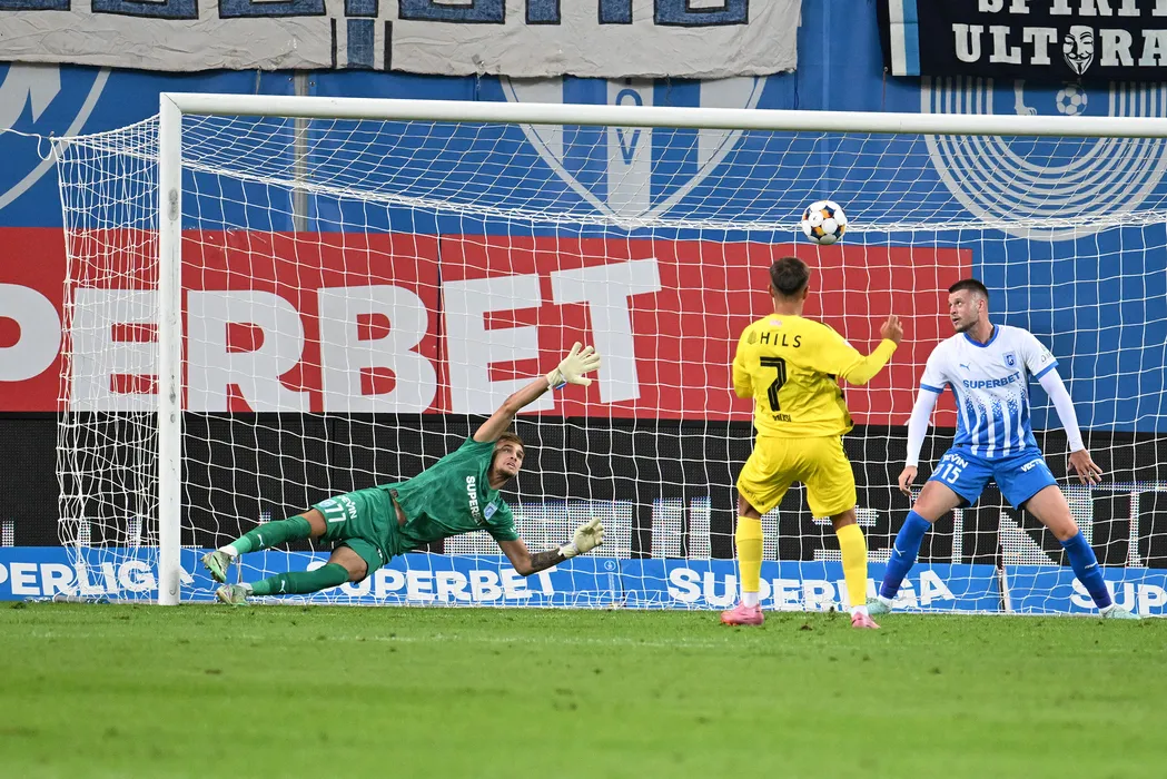 Alexandru Marian Musi marchează un gol în poarta lui Pavlo Isenko de langa Juraj Badelj in meciul dintre Universitatea Craiova si Dinamo Bucuresti, contand pentru Superliga Superbet, desfasurat pe Stadionul Ion Oblemenco din Craiova, vineri 26 septembrie 2025. © FOTO:Razvan Pasarica/SPORT PICTURES