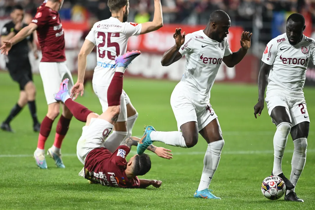 Alexandru Ionita este faultat in careu dupa un duel cu Christopher Braun, Bismark Adjei Boateng si Bogdan Ionut Tiru in meciul de fotbal dintre Rapid Bucuresti si CFR Cluj, contand pentru Play-off-ul Superligii Superbet, desfasurat pe Stadionul Rapid Giulesti din Bucuresti, duminica 1 mai 2023. © FOTO:Razvan Pasarica/SPORT PICTURES