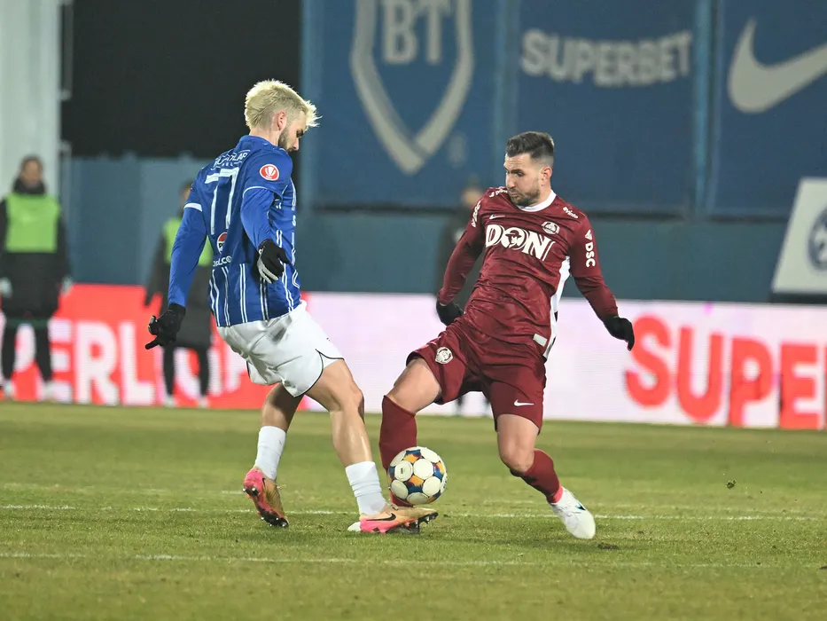 Diogo Sa Ramalho si Constantin Adrian Păun in meciul de fotbal dintre Farul Constanta si CFR Cluj, contand pentru Superliga Superbet, desfasurat pe Stadionul central al Academiei Gheorghe Hagi din Ovidiu, sambata 28 februarie 2026. © FOTO:Sorin Danielciuc/SPORT PICTURES