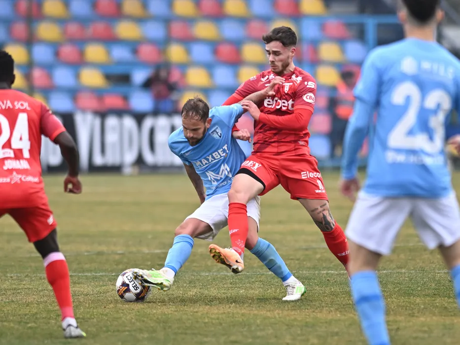 Juan Bautista Cascini si Andrej Fabry în meciul de fotbal dintre FC Voluntari si UTA Arad, contând pentru Superliga Superbet, desfășurat pe Stadionul Anghel Iordanescu din Voluntari, sambata 17 februarie 2024. © FOTO: Răzvan PĂSĂRICĂ/SPORT PICTURES