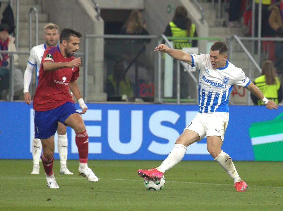 Carlos Andrei Mora Montoya si Stratos Svarnas in meciul de fotbal dintre Raków Częstochowa si Universitatea Craiova, contand pentru Conference League, desfasurat pe Zagłębiowski Park Sportowy din Sosnowiec, joi 2 octombrie 2025. © FOTO:Ionut Stanca/SPORT PICTURES