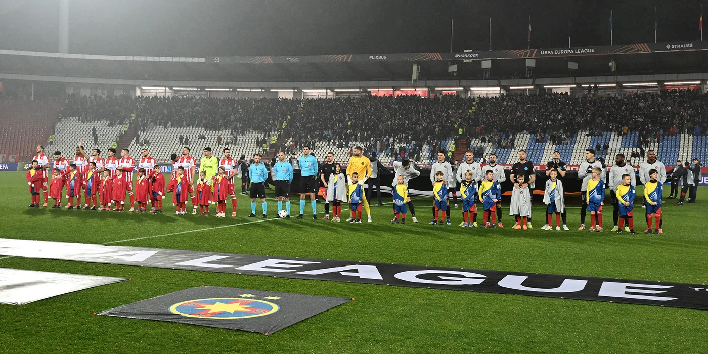 Fotbalistii celor doua echipe alaturi de brigada de arbitrii la startul meciului de fotbal dintre Steaua Rosie Belgrad si FCSB, din cadrul UEFA Europa League, desfasurat pe Stadionul Rajko Mitić din Belgrad, joi 27 noiembrie 2025. © FOTO:Razvan Pasarica/SPORT PICTURES