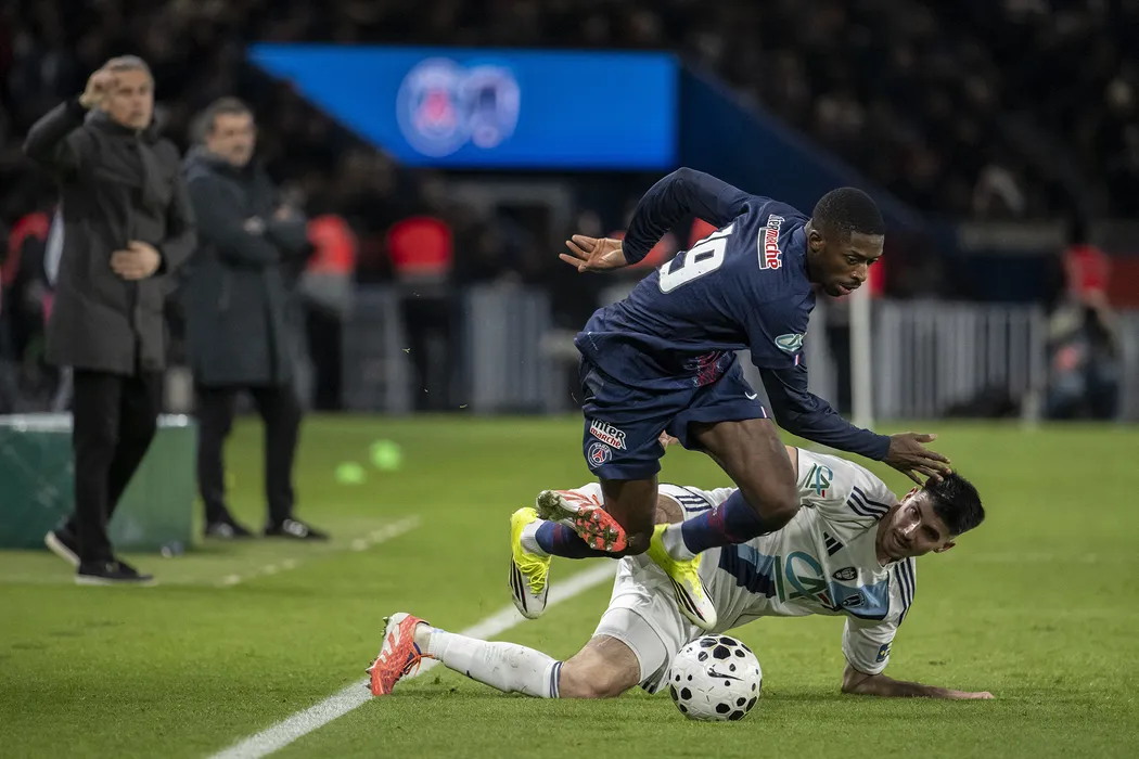 Paris Saint-Germain's French forward #19 Ousmane Dembele (top) and Paris FC's Belgian defender #12 Thibault De Smet fight for the ball during the French Cup round of 32 football match between Paris Saint-Germain (PSG) and Paris FC at the Parc des Princes stadium in Paris on January 12, 2026.Photo by Eliot Blondet/ABACAPRESS.COM