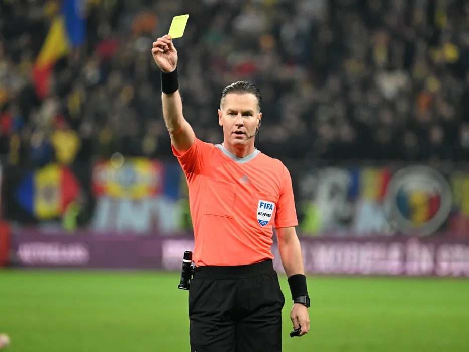 Arbitrul central Danny Makkelie acorda un cartonas galben in meciul de fotbal dintre Romania si Bosnia Hertegovina, din cadrul Preliminariilor Campionatului Mondial 2026, desfasurat pe Arena Nationala din Bucuresti, vineri 21 martie 2025. © FOTO:Razvan Pasarica/SPORT PICTURES