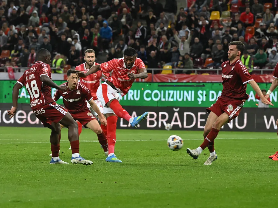 Olimpiu Vasile Morutan, Mamoudou Karamoko, Lars Kramer si Kennedy Kofi Boateng in meciul de fotbal dintre Dinamo Bucuresti si Rapid Bucuresti, din cadrul Play off-ului Superligii Superbet, desfasurat pe Arena Nationala din Bucuresti, duminica 26 aprilie 2026. © FOTO:Razvan Pasarica/SPORT PICTURES