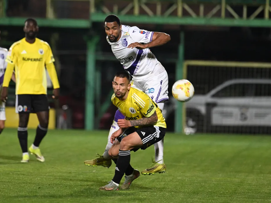 Dino Mikanovic si Abdel Bettaieb in meciul de fotbal dintre FC Arges si Universitatea Cluj, semifinala Cupei Romaniei Betano, desfasurat pe Stadionul Orasenesc din Mioveni, marti 21 aprilie 2026. © FOTO:Razvan Pasarica/SPORT PICTURES