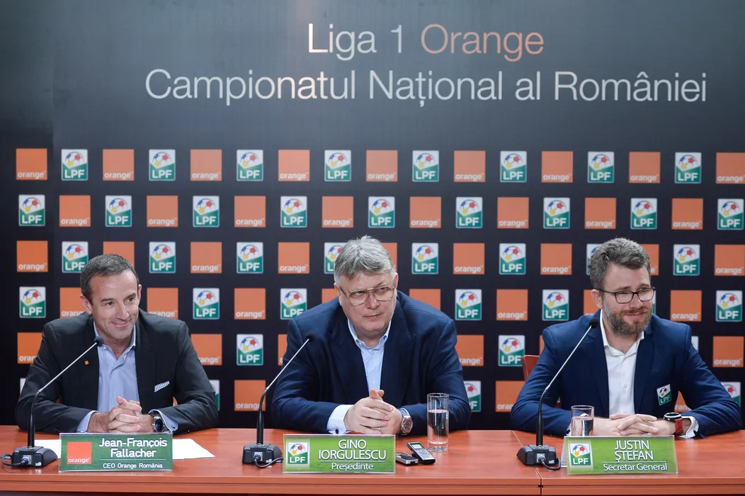 Directorul executiv al Orange Romania, Jean-Francois Fallacher(s) , presedintele Ligii Profesiniste de Fotbal, Gino Iorgulescu(c) si Justin Stefan (d), secretarul general al LPF sustin o conferinta de presa prilejuita de anuntarea noului partener oficial al LPF, in Bucuresti, luuni, 16 noiembrie 2015. Liga Profesionista de Fotbal a încheiat, luni, 16 noiembrie 2015, un parteneriat de imagine cu Orange Romania, in urma caruia prima divizie de fotbal se va numi Liga I Orange, iar noii abonati ai companiei de telecomunicatii vor avea acces nelimitat la meciurile din prima liga pe telefon, tableta sau laptop. DRAGOS SAVU / MEDIAFAX FOTO