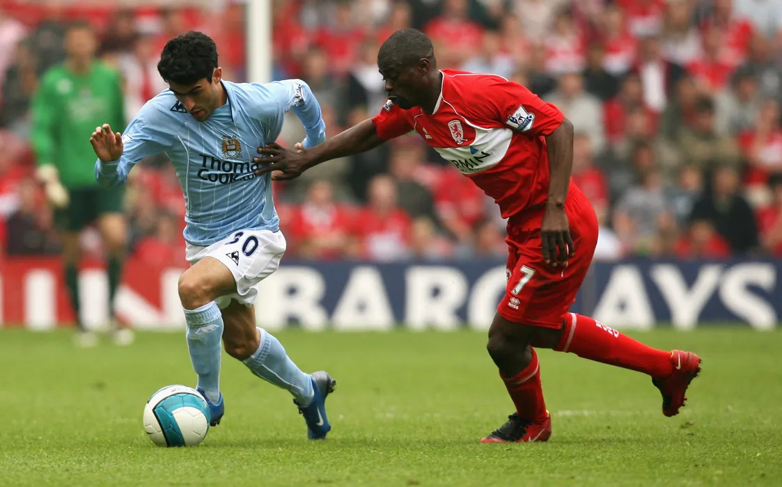MIDDLESBROUGH, UNITED KINGDOM - MAY 11: Nery Castillo of Manchester City is tackled by George Boateng of Middlesbrough during the Barclays Premier League Match between Middlesbrough and Manchester City at Riverside Stadium on May 11, 2008 in Middlesbrough, England. (Photo by Warren Little/Getty Images)