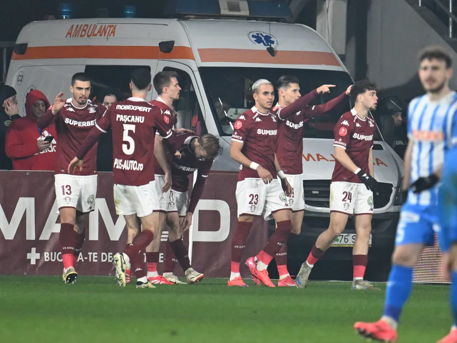 Bucurie a fotbalistilor rapidisti Denis Ciobotariu, Mattias Kait, Tobias Christensen, Cristian Marian Manea, Mihai Alexandru Dobre si Sebastian Andrei Borza dupa un gol marcat in meciul de fotbal dintre Rapid Bucuresti si Universitatea Craiova, din cadrul Superligii Superbet, desfasurat pe Superbet Arena-Giulesti din Bucuresti, sambata 25 ianuarie 2025. © FOTO:Razvan Pasarica/SPORT PICTURES