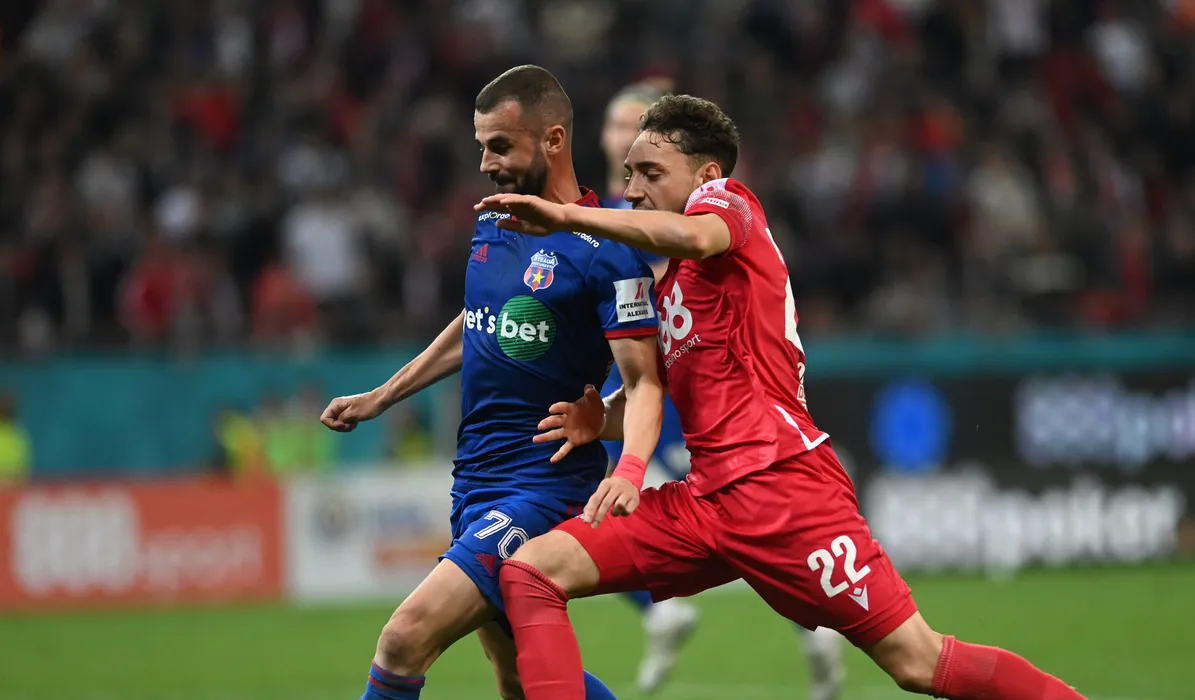 Laurentiu Corbu si Ahmed Mustafa Bani in meciul de fotbal dintre Dinamo Bucuresti si CSA Steaua Bucuresti, contand pentru Play-off-ul Ligii a-2-a Casa Pariurilor, desfasurat pe Arena Nationala din Bucuresti, luni 15 mai 2023. © FOTO:Razvan Pasarica/SPORT PICTURES