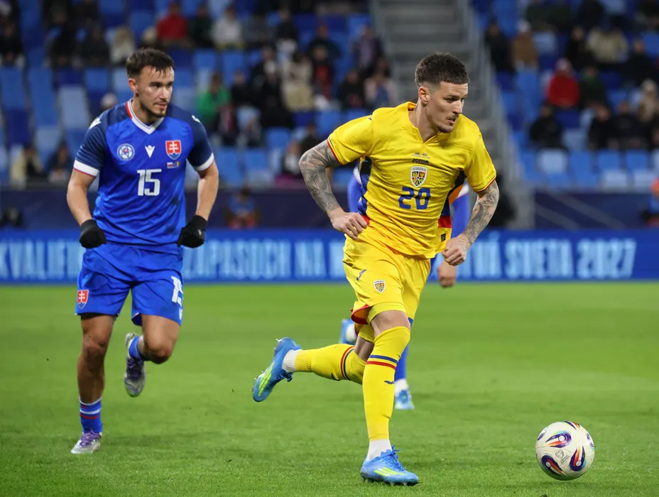 Dennis Man si David Strelec in meciul amical de fotbal dintre Slovacia si Romania, desfasurat pe “Narodny futbalovy stadion” din Bratislava, marti 31 martie 2026. © FOTO:SPORT PICTURES