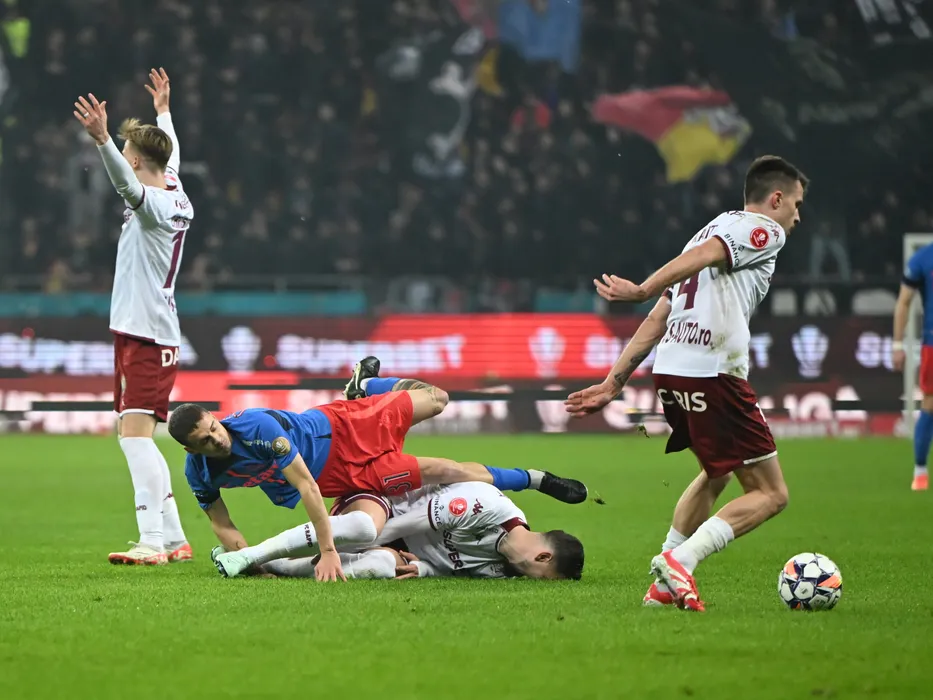 Juri Cisotti si Mattias Kait in meciul de fotbal dintre Rapid Bucuresti si FCSB, din cadrul Superligii Superbet, desfasurat pe Arena Nationala din Bucuresti, duminica 2 martie 2025. © FOTO:Razvan Pasarica/SPORT PICTURES