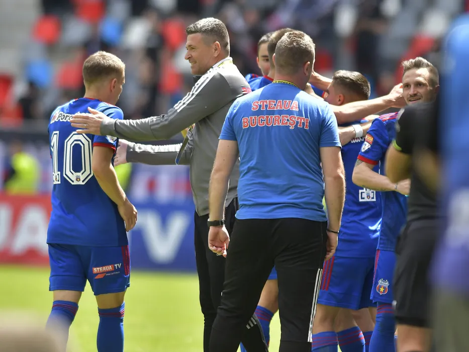Rares Enceanu se bucura dupa un gol marcat alaturi de Daniel Oprita in meciul de fotbal dintre Steaua Bucuresti si Unirea Slobozia, contand pentru Play-off-ul Ligii a-2-a Casa Pariurilor, desfasurat pe Stadionul Steaua-Ghencea din Bucuresti, duminica 8 mai 2022. © FOTO:Razvan Pasarica/SPORT PICTURES