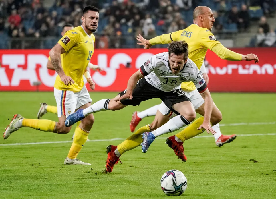 Germany's Jonas Hofmann (front) and Romania's Vlad Chiriches (R) fight for the ball in meciul de fotbal dintre Germania si Romania, contand pentru preliminariile Campionatului Mondial din 2022, desfasurat pe Stadionul Vorksparkstadion din Hamburg, vineri 8 octombrie 2021. © FOTO:SPORT PICTURES