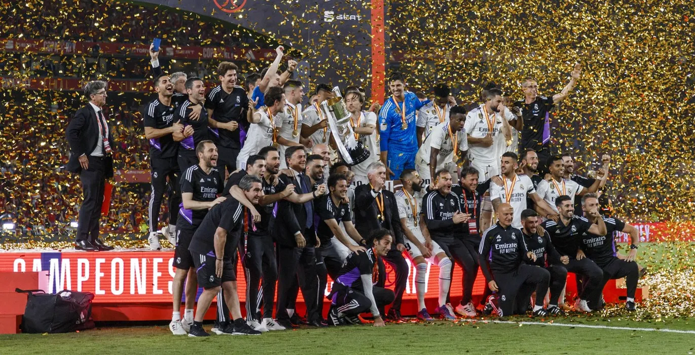 SEVILLA, SPAIN - MAY 07: Players of Real Madrid pose for a team photo after winning the Copa del Rey final soccer match between Real Madrid and Osasuna at the La Cartuja Stadium in Sevilla, Spain on May 07, 2023. Pablo Garcia Sacristan / Anadolu Agency/ABACAPRESS.COM,Image: 774316630, License: Rights-managed, Restrictions: , Model Release: no