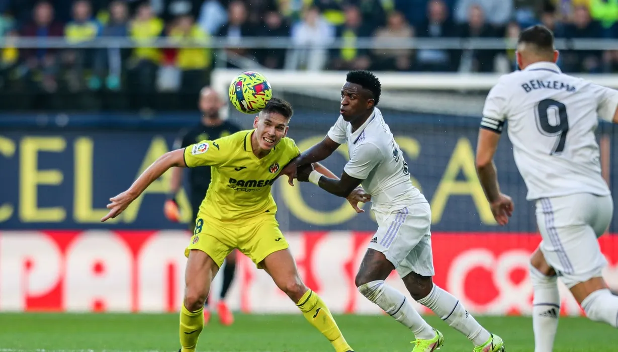 Juan Foyth of Villarreal and Vinicius Junior of Real Madrid in action during the Santander League match between Villareal CF and Real Madrid at the La Ceramica Stadium on January 7, 2023, in Castellon, Spain.