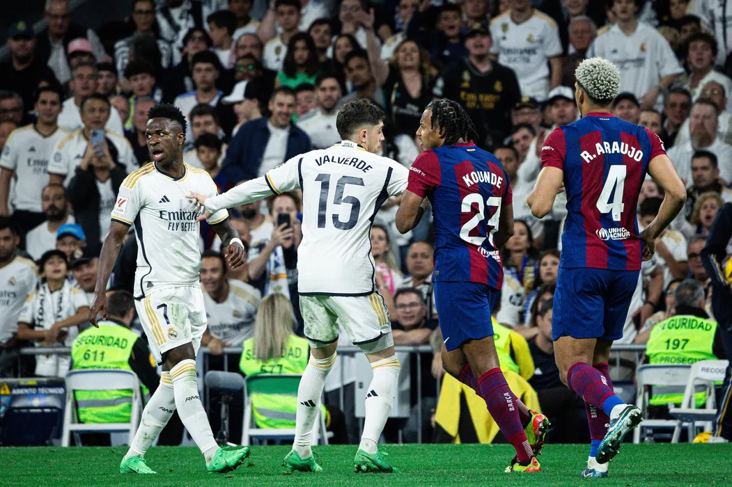 Real Madrid CF v FC Barcelona, Barca - LaLiga EA Sports MADRID, SPAIN, APR 21: Fede Valverde of Real Madrid CF, Vinicius Jr of Real Madrid CF, Jules Kounde of FC Barcelona and Ronald Araujo of FC Barcelona during the LaLiga EA Sports match between Real Madrid CF and FC Barcelona at Estadio Santiago Bernabeu April 21, 2024 in Madrid, Spain. Madrid Santiago Bernabeu Madrid Spain Copyright: xAlexxPerezx RealMadridBarcelona21-04 43,Image: 868099005, License: Rights-managed, Restrictions: Credit images as "Profimedia/ IMAGO", Model Release: no