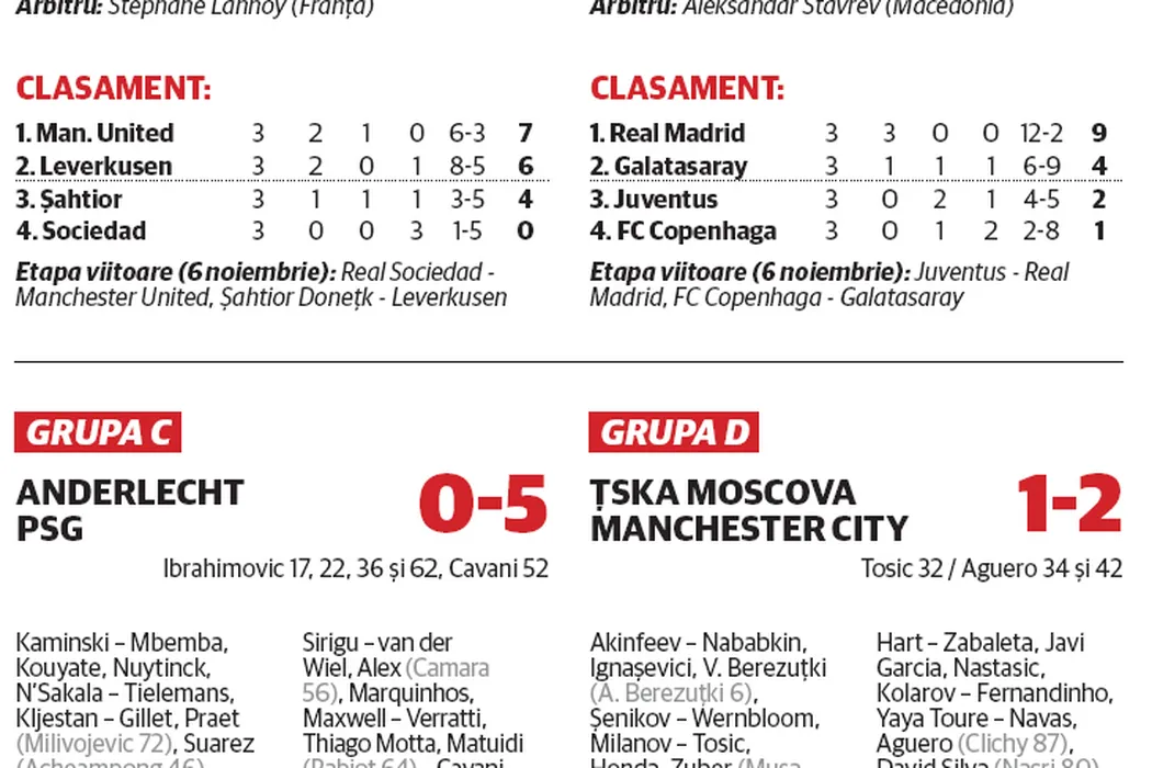 Real Madrid – Juventus 2-1, Leverkusen – Șahtior 4-0, Anderlecht – PSG 0-5! „Poker” Ibra, într-o seară magică de Champions League