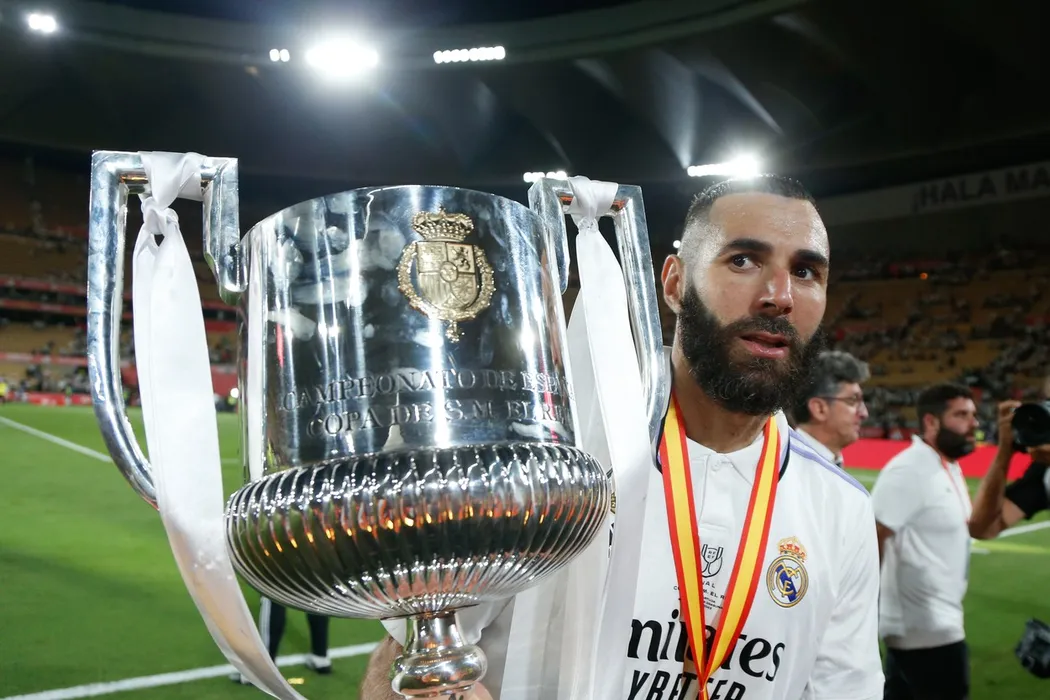 May 7, 2023, SEVILLA, SEVILLA, SPAIN: Karim Benzema of Real Madrid celebrates with the Champions trophy during the spanish cup, Copa del Rey, Final football match played between Real Madrid and CA Osasuna at Estadio de la Cartuja on May 06, 2023, in Sevilla, Spain.,Image: 774315756, License: Rights-managed, Restrictions: , Model Release: no