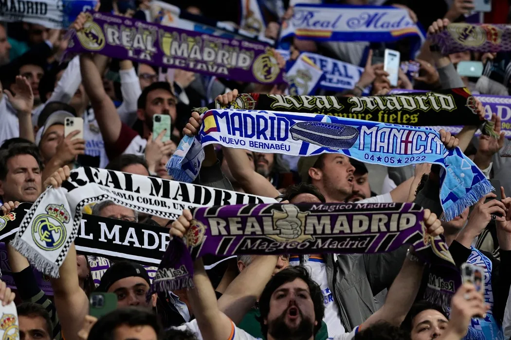 Real Madrid fans hold up their scarves prior to the UEFA Champions League semi-final second leg football match between Real Madrid CF and Manchester City at the Santiago Bernabeu stadium in Madrid on May 4, 2022.,Image: 688664872, License: Rights-managed, Restrictions: , Model Release: no