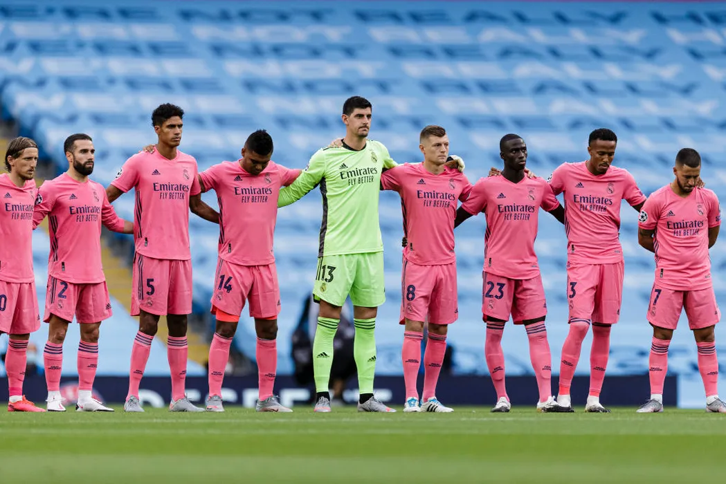 MANCHESTER, ENGLAND - AUGUST 07: Real Madrid squad getting into the field during the UEFA Champions League round of 16 second leg match between Manchester City and Real Madrid at Etihad Stadium on August 7, 2020 in Manchester, United Kingdom. (Photo by Ricardo Nogueira/Eurasia Sport Images/Getty Images)