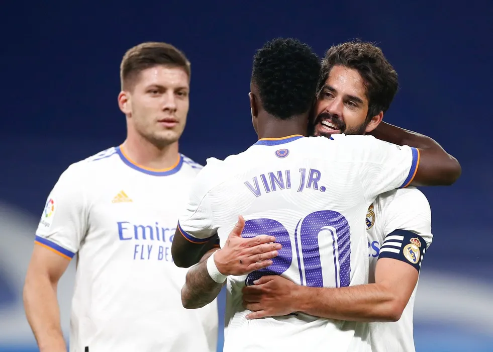 MADRID, SPAIN - SEPTEMBER 22: Isco Alarcón and Vini Jr. both of Real Madrid celebrating a goal with teammate Luka Jović during the La Liga Santader match between Real Madrid CF and RCD Mallorca (Photo by Helios de la Rubia/Real Madrid via Getty Images)
