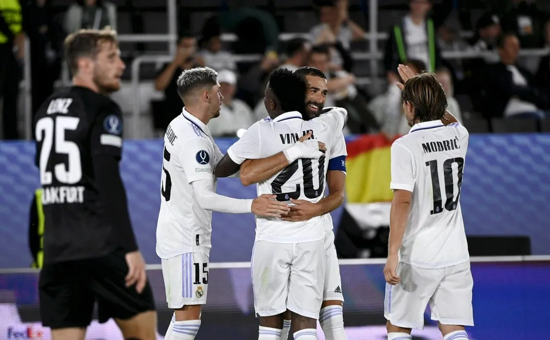 From left, Federico Valverde, Vinicius Junior, Karim Benzema and Luka Modric of Real Madrid celebrating after Benzema scored 2-0 goal and Christopher Lenz of Eintracht Frankfurt walks by during the UEFA Super Cup football match Real Madrid vs Eintracht Frankfurt at the Olympic Stadium in Helsinki, Finland on August 10, 2022.