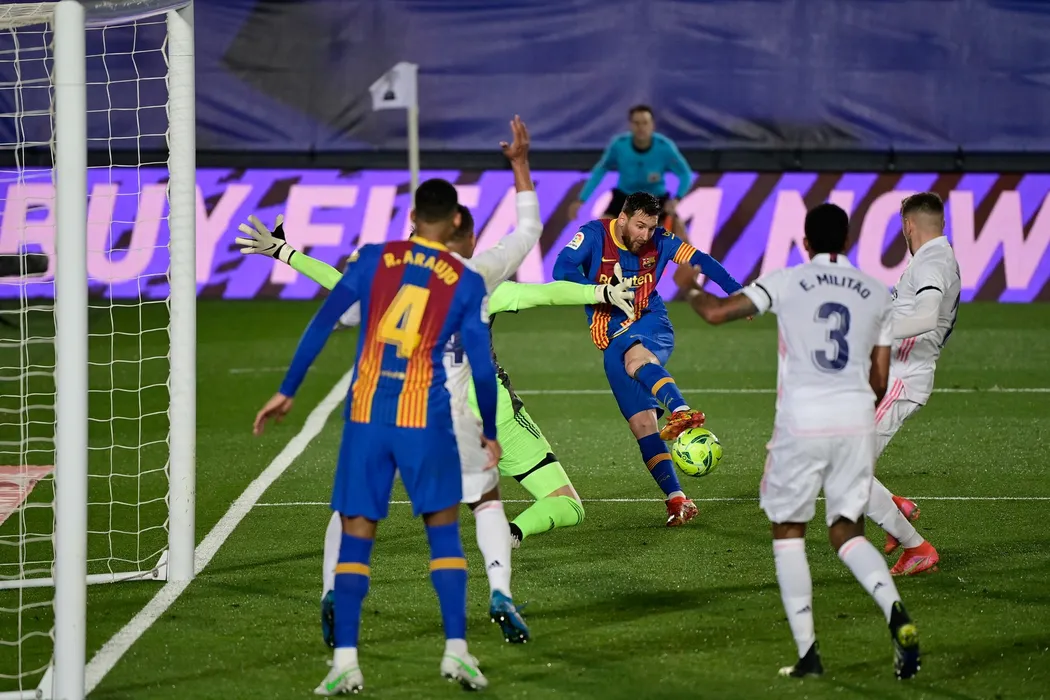 Barcelona's Argentinian forward Lionel Messi (C) kicks the ball during the "El Clasico" Spanish League football match between Real Madrid CF and FC Barcelona at the Alfredo di Stefano stadium in Valdebebas, on the outskirts of Madrid on April 10, 2021.,Image: 604640198, License: Rights-managed, Restrictions: , Model Release: no