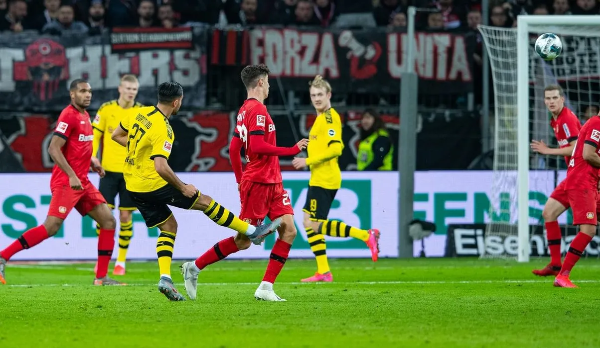 08 February 2020, North Rhine-Westphalia, Leverkusen: Football: Bundesliga, Bayer Leverkusen - Borussia Dortmund, 21st matchday in the BayArena. Dortmund's Emre Can (3rd from left) scores the goal against Leverkusen's Kai Havertz for the 1:2 Photo: Guido Kirchner/dpa - IMPORTANT NOTE: In accordance with the regulations of the DFL Deutsche Fußball Liga and the DFB Deutscher Fußball-Bund, it is prohibited to exploit or have exploited in the stadium and/or from the game taken photographs in the form of sequence images and/or video-like photo series., Image: 497198557, License: Rights-managed, Restrictions: GERMANY OUT, Model Release: no, Credit line: Guido Kirchner / AFP / Profimedia