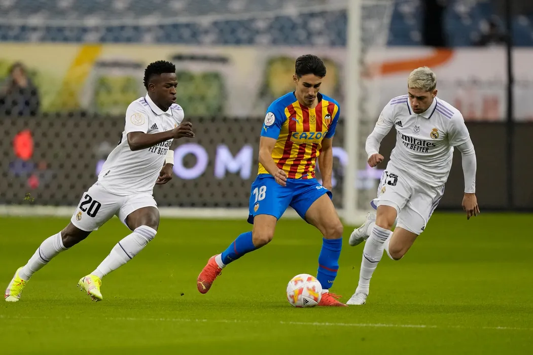 Valencia's Andre Almeida passes the ball between Real Madrid's Vinicius Junior, left, and Federico Valverde during a semi-final of the Spanish Super Cup between Real Madrid and Valencia in Riyadh, Saudi Arabia, Wednesday, Jan. 11, 2023.,Image: 749087884, License: Rights-managed, Restrictions: This content is intended for editorial use only. For other uses, additional clearances may be required., Model Release: no, Pictured: Andre Almeida